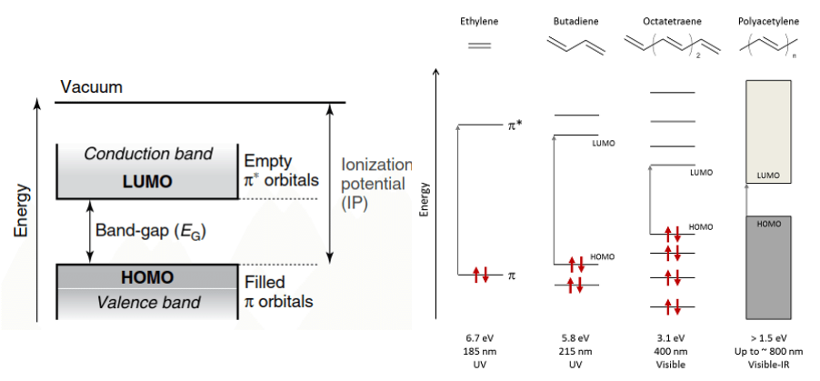 이러한 유기반도체의 band structure는 다수의 단분자 오비탈간의 중첩(overlap between single molecule orbital)에 의해 형성된다. 각 분자의 π orbital이 인접한 분자의 orbital과 중첩되며 이는 유기반도체의 band gap으로 나타난다. 일반적인 유기반도체의 band gap은 1.5 ~ 5 eV로 알려져 있다.