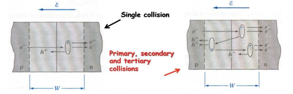 Avalanche Breakdown이 일어나는 주요 원인은 impact ionization이다. 강력한 voltage에 의해 electron이 depletion region에 들어서게 되면 atom과 충돌하게 된다. 이때 atom이 이온화되면서 EHP(electron hole pair)가 형성되며 이렇게 생성된 carrier들이 이동하다가 다른 atom과 충돌하여 또 다른 EHP를 생성하게 된다. 이 과정이 반복되면서 전류가 발생하게 되는 것이다. (carrier multiplication)
