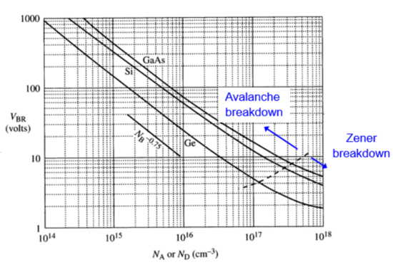 종합하자면 doping 농도가 높을 수록 low voltage에서 zener breakdown이 일어나며, 반대로 doping 농도가 낮으면 high voltage에서 avalanche breakdown이 일어난다.
