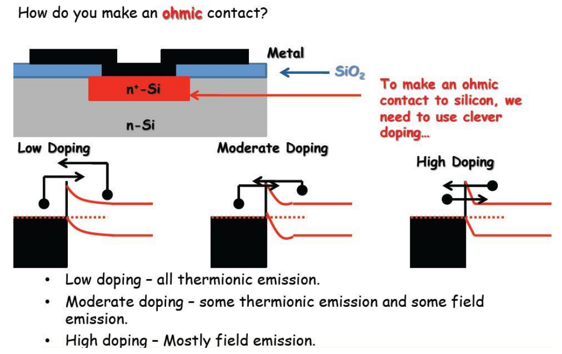 그 방법으로는 contact이 일어나는 부분에만 heavy doping을 해주는 방법이다. 이렇게 heavy doping을 해줄 경우 depletion region의 폭이 좁아지게 되므로 schottky barrier가 존재하더라도 tunneling에 의해 metal에서 semiconductor로 넘어갈 수 있게되어 양방향으로 전류가 흐르게 되는 ohmic contact과 같은 성질을 갖게 된다.