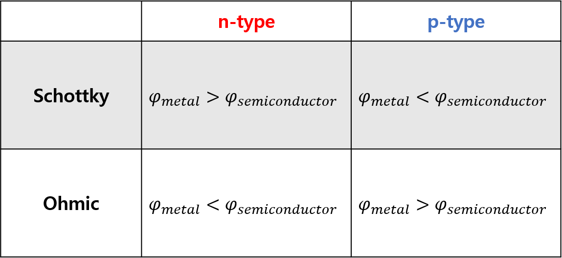 semiconductor의 work function은 doping에 의해, metal의 work function은 material의 고유 성질에 따라 결정되게 되는데, 이러한 semiconductor-metal contact에서는 주로 ohmic contact의 성질이 선호된다.