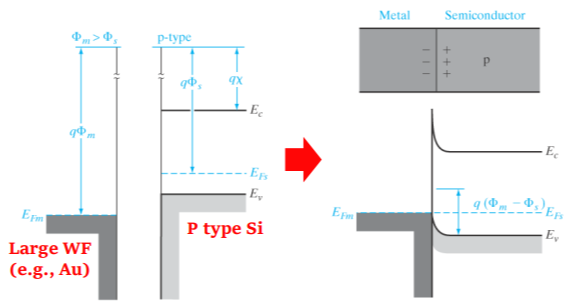 p-type semiconductor의 경우 metal의 work function이 semiconductor의 work function 보다 큰 경우가 ohmic contact이 된다.