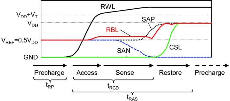 BL전압이 미세하게 증가한다면 커패시터가 충전된 상태로 데이터 '1'이 읽히며, 반대로 미세하게 감소한다면 커패시터가 방전된 상태로 데이터 '0'이 읽히는 것이다. 이런 전위차를 sense amplifier로 증폭시킨 후 측정하여 구분한다.