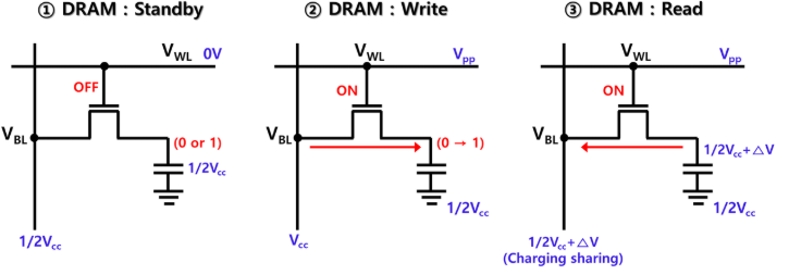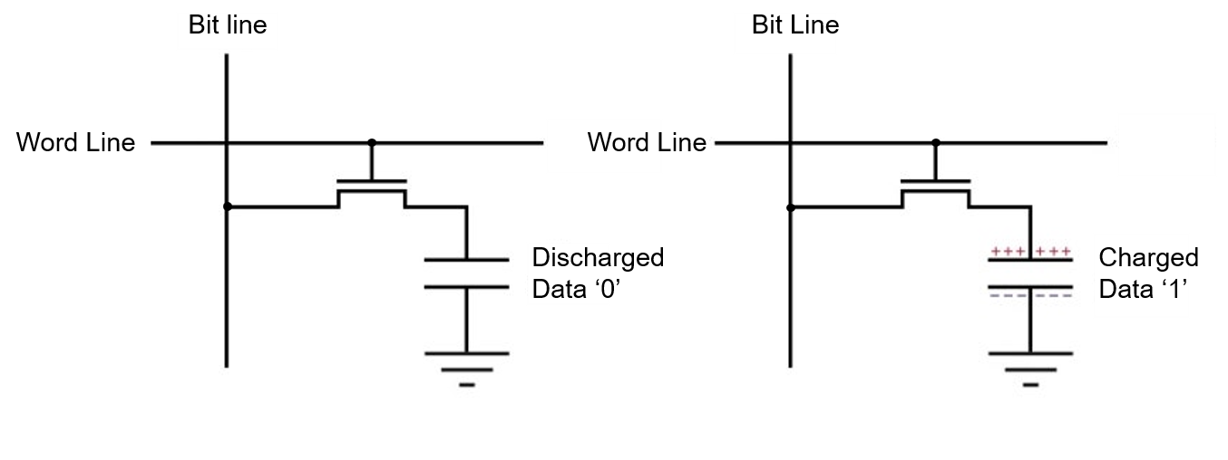 커패시터에 전류를 흘려 충전하는 방식으로 메모리를 저장하며 커패시터에 전하가 저장되어 있는지 여부에 따라 데이터 '1'과 '0'을 구분하는 메모리 소자이다.