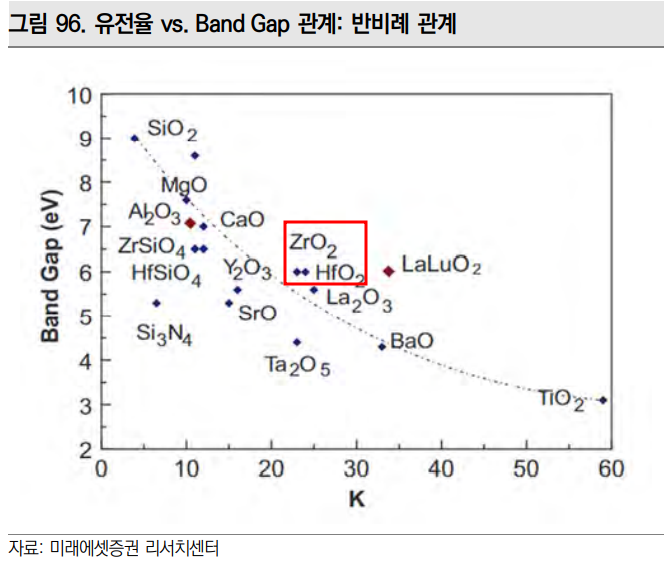 그래서 이러한 trade-off 관계를 고려하여 현재는 20~25의 높은 유전율과 5~7eV의 적절한 Energy bandgap을 갖는 HfO₂ 또는 ZrO₂ 가 High-k 소재로 사용되었다.