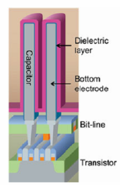그러나 최근 반도체 공정의 미세화가 진행되면서 셀 크기나 간격이 모두 작아지면서 최근 커패시턴스를 확보하기 위한 공간 및 구조에 큰 제약이 생기고 있다.